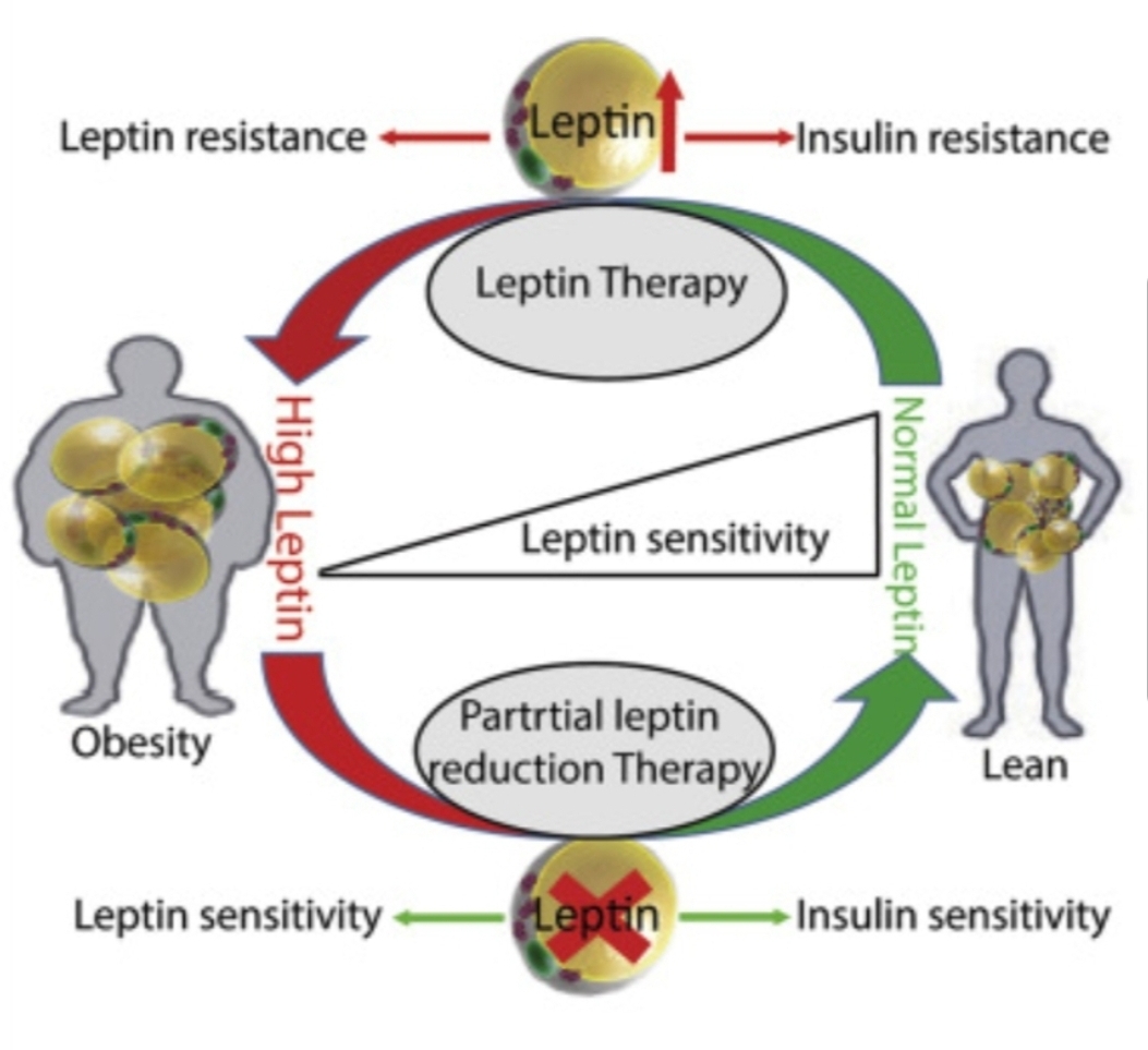 비만 유전자인 ob 가 결여된 쥐의 경우 렙틴 합성이 안되므로 정상 쥐에 비해 체중이 증가하며, 이때 렙틴을 주사하면 지방세포의 지방이 감소한다.