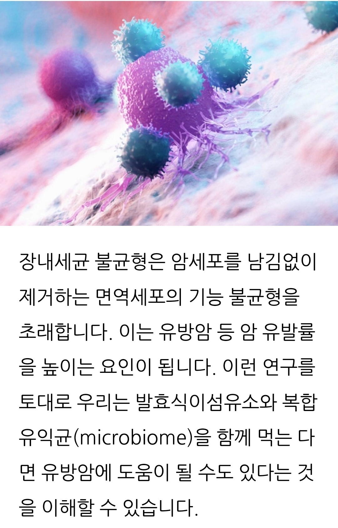 암세포를 제거하는 면역세포 활성은 장내 유익균 비율이 높으면 활성 되지만 장내 유해균 비율이 높으면 면역세포 활성 및 활동을 저하시켜 암 억제력이 떨어집니다.
