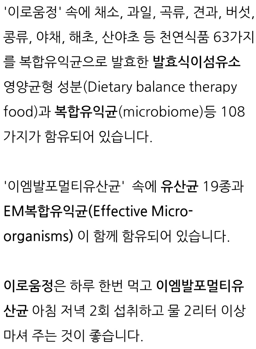 발효식이섬유소와 복합유익균(microbiome)을 함께 섭취하는 방법으로 '이로움정'과 '이엠발포멀티유산균'을 함께 먹는 방법도 있습니다.