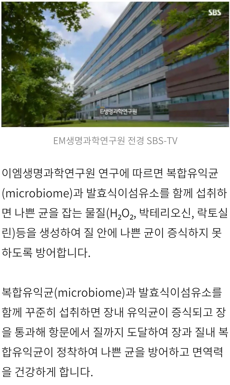 복합유익균과 복합유익균(microbiome)을 키우는 먹이원인 발효식이섬유소가 함유된 식품은 '복합유익균 식이균형식 분말' 입니다.