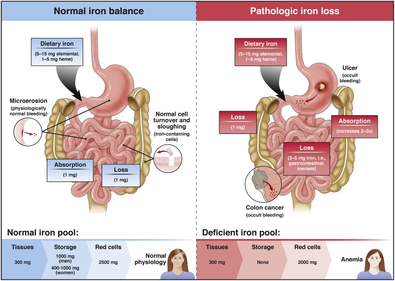 철결핍빈혈의 가장 큰 원인은 지속적인 출혈로 체내의 철분이 과다하게 손실되는 것입니다. 월경량이 많은 여성, 소화성 궤양이 있는 사람, 아스피린이나 다른 비스테로이드 소염제를 장기 복용함에 따라 위점막에 출혈이 생긴 사람에게 나타날 수 있습니다.