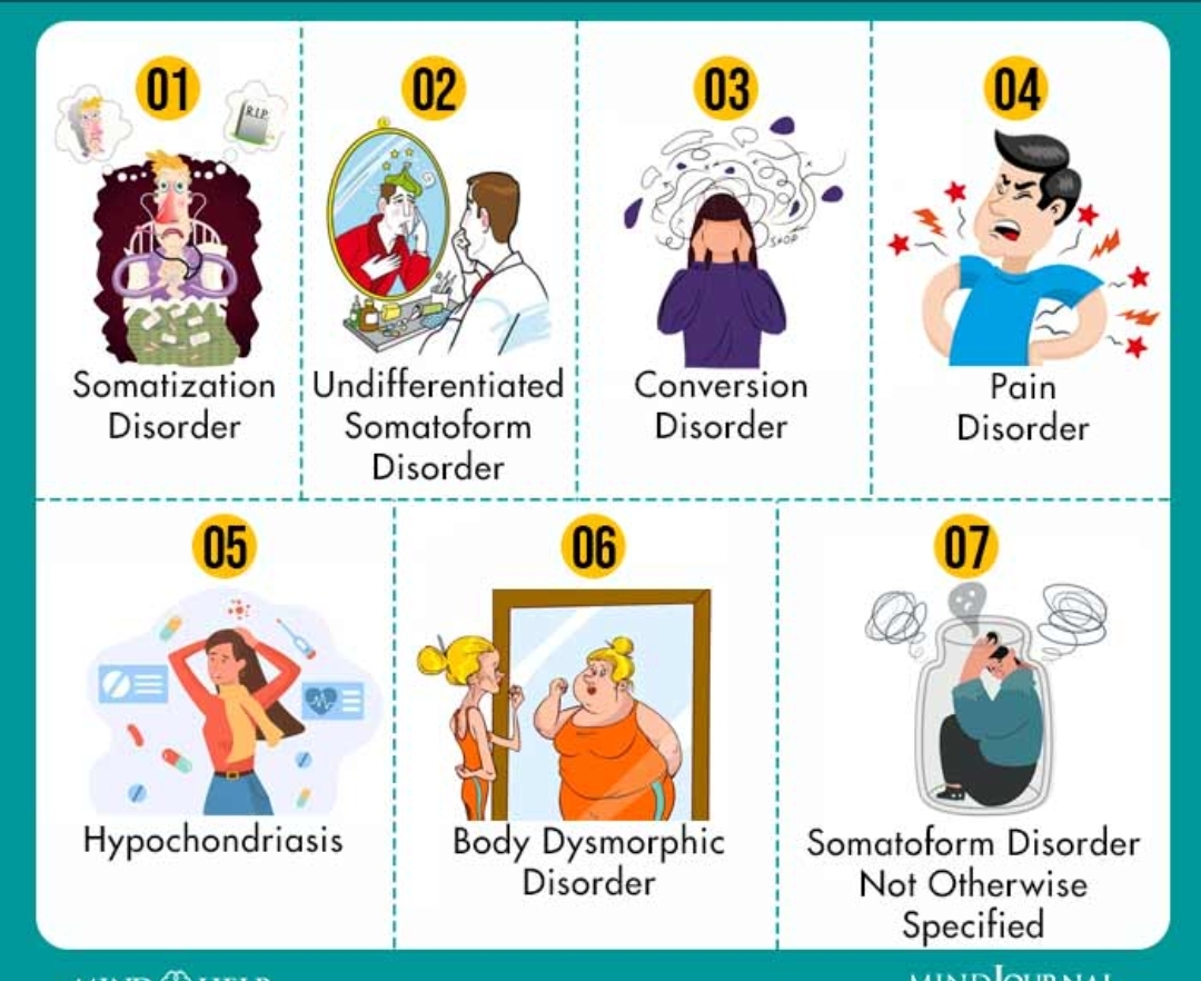 ⑤ 비정형 신체화장애 : 자신의 외모에 결함이 있다고 상상하거나 과장하는 증상입니다. 흔히 여드름, 주름살, 흉터, 얼굴색, 안면비대칭 등 머리와 얼굴 부위의 결점을 호소하기도 하고 성기·유방·엉덩이 등에 집착하기도 합니다. 이 증상에 걸린 환자는 가상의 결함을 교정하기 위해 외과치료를 받지만 이는 장애를 더욱 악화시켜서 새로운 집착에 이르게 합니다.