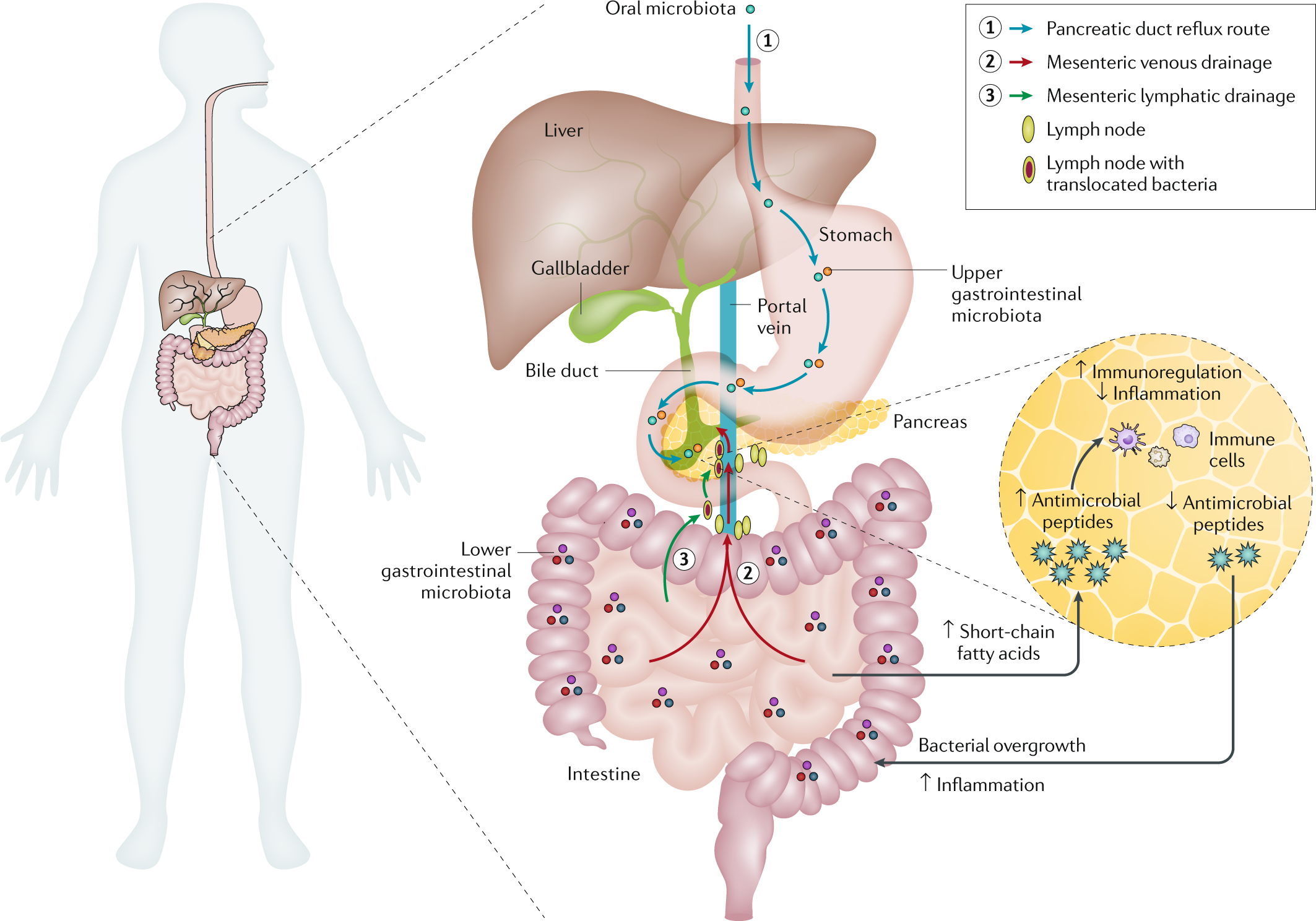 장내 나쁜 균들이 급증하면 장벽을 통해 나뿐 균과 바이러스 그리고 이들 염증소체(inflammasome)가 혈관 유입 장간순환작용에 의해 간과 췌장을 공격해 췌장과 간을 약하게하고 이로 인해 간질환과 췌장염 원인이 된답니다.