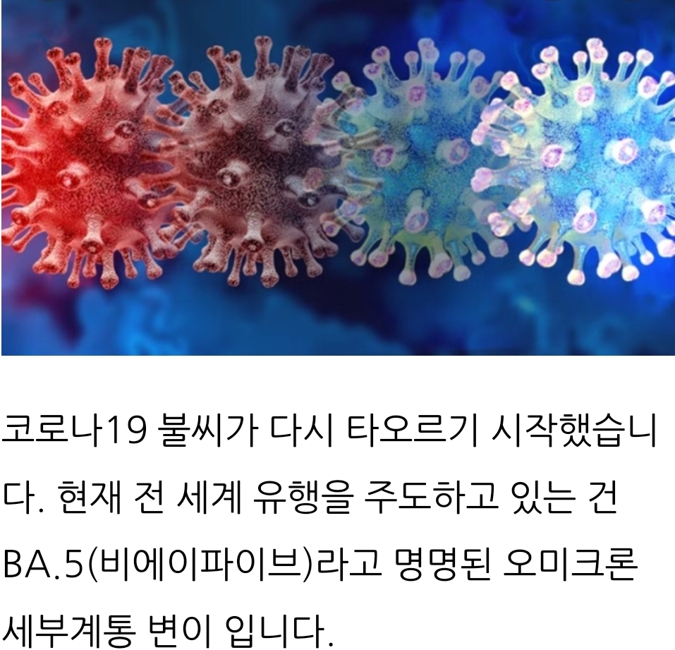 코로나19 백신이나 자연 감염으로 생긴 면역을 회피하는 특성이 있는 BA.5, 우세종으로 자리 잡으면 재감염과 돌파감염이 잇따를 수 있습니다.