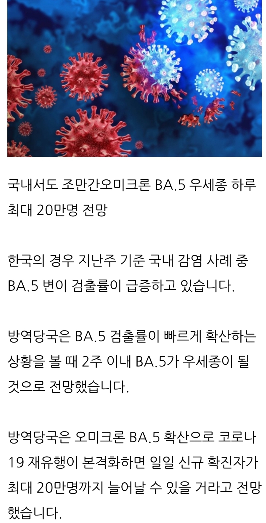 방역당국은 코로나19 바이러스 변이 오미크론 BA.5의 해외 유행 상황 등을 분석한 결과 위중증과 사망 증가가 뚜렷하게 관찰되진 않고 있다며, 방역 조치 강화는 고려하고 있지 않다고 밝혔습니다.